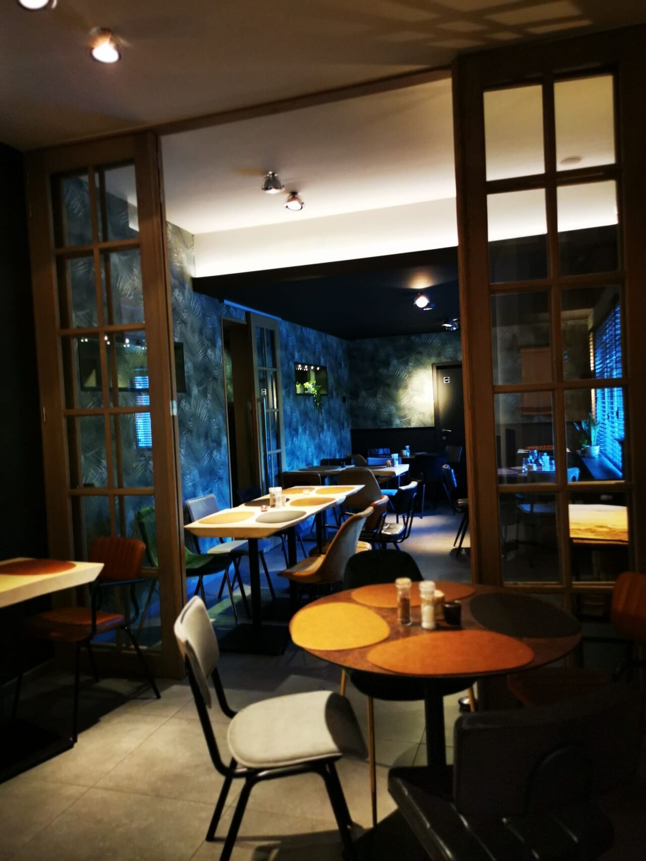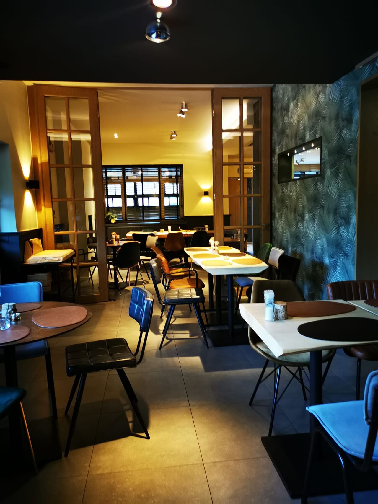 Natuurlijke houttinten, kleurrijke stoelen gecombineerd met gezellige ronde tafels.
